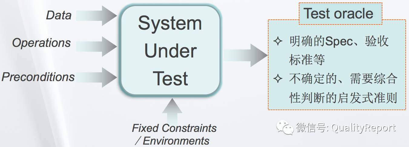 有了系统性的思维,对测试结构、黑盒测试方法等会重新审视,这样可以把握测试自身、测试方法的精髓。例如,对软件测试、黑盒方法,我们就会关注测试的输入、输出,还会关注被测系统( 延伸为“被测对象”)的所处环境、条件、接口等。针对输入,也不仅仅看到正常的输入数据,而且要考虑异常的数据输入、不同角色的用户操作等等。针对Test Oracle也不局限于Spec/标准等确定性的准则,还有不确定性的准则。